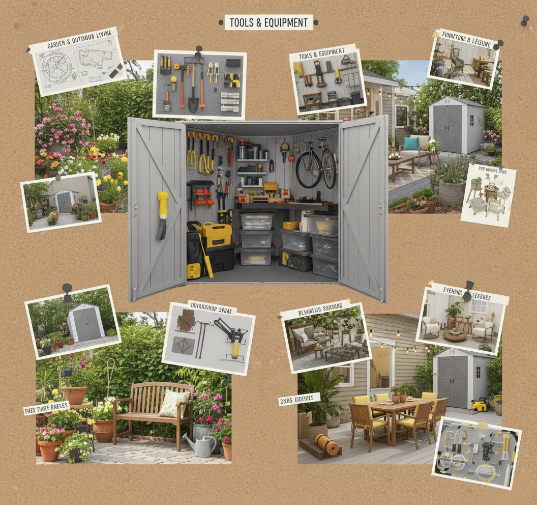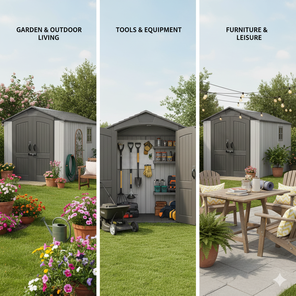 مثالية لتخزين الأغراض المنزلية مثل السلالم، المكانس الكهربائية، العدد والأدوات، معدات الحدائق، الدراجات، الأثاث، المراتب، الشماسي، مستلزمات حمامات السباحة، وغيرها